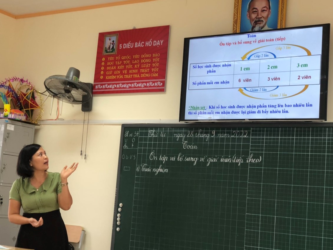 Dưới sự hướng dẫn của giáo viên, học sinh lớp 5D cùng nhau trải nghiệm thực tế bằng bài toán chia phấn đơn giản. Cô giáo điều chỉnh ngữ liệu bài toán trở nên gần gũi với cuộc sống hàng ngày, qua đó học sinh dễ dàng nhận biết mối quan hệ giữa hai đại lượng và tự tìm tòi các cách giải toán. Cô Nga sử dụng nhiều phương pháp dạy học tích cực vào giảng dạy. Học sinh được hoạt động nhóm, hoạt động cá nhân, cùng giao tiếp, tương tác với cô giáo, với các bạn để phát triển phẩm chất, năng lực. Học sinh diễn đạt lưu loát, trình bày hiểu biết về kiến thức bài học, kiến thức thực tế. Qua cách dạy của cô giáo dạy lớp 5D cho thấy môn Toán rất gần gũi, nhẹ nhàng.
