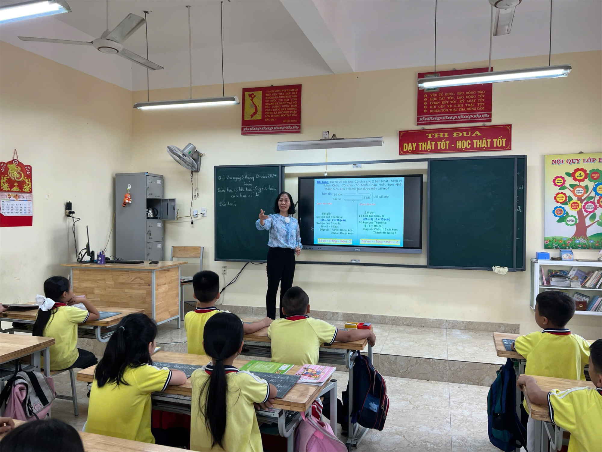 🎯 Với mục tiêu giúp học sinh hiểu sâu và nắm chắc phương pháp giải bài toán “Tìm hai số khi biết tổng và hiệu” thông qua các bước cụ thể. Hình thành tư duy logic, khả năng suy luận và phân tích vấn đề, hôm nay, ngày 3/12/2024, tổ khối 4 thực hiện chuyên đề: “Vận dụng linh hoạt các phương pháp và hình thức tổ chức dạy học trong môn Toán 4”. Tiết học do cô giáo Phạm Hải Hà cùng các em học sinh lớp 4B Trường Tiểu học Lý Tự Trọng thực hiện.