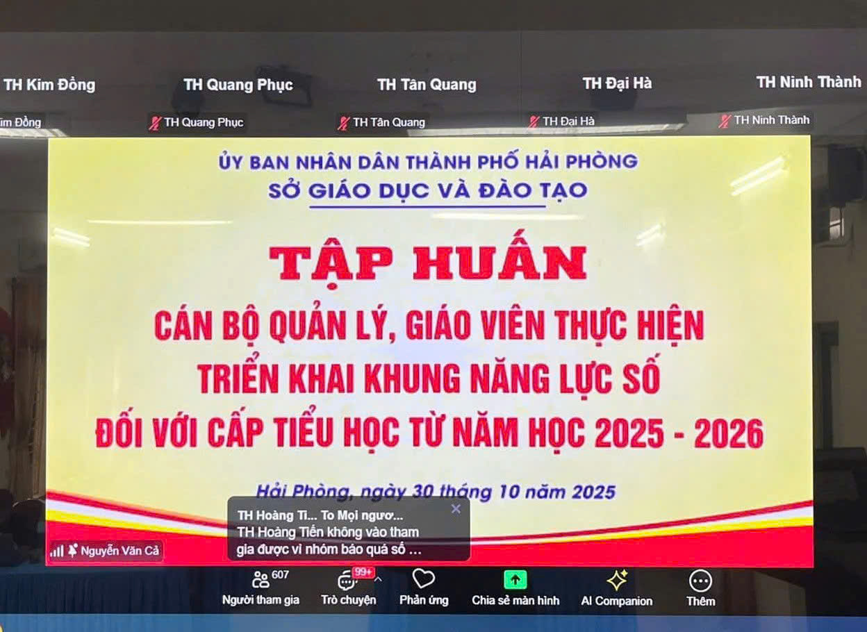 Thực hiện Thông tư số 02/2025/TT-BGDĐT ngày 24/01/2025 của Bộ Giáo dục và Đào tạo ban hành Khung năng lực số cho người học; Công văn số 3456/BGDĐT-GDPT ngày 27/6/2025 về việc hướng dẫn triển khai thực hiện Khung năng lực số cho học sinh phổ thông và học viên giáo dục thường xuyên; cùng Kế hoạch số 7708/KH-SGDĐT ngày 20/10/2025 của Sở Giáo dục và Đào tạo Hải Phòng về việc tổ chức tập huấn triển khai thực hiện Khung năng lực số trong các cơ sở giáo dục trên địa bàn thành phố — ngày 30/10/2025, Ban Giám hiệu cùng toàn thể cán bộ, giáo viên Trường Tiểu học Lý Tự Trọng đã tham gia đầy đủ buổi tập huấn trực tuyến do Sở GD&ĐT tổ chức.